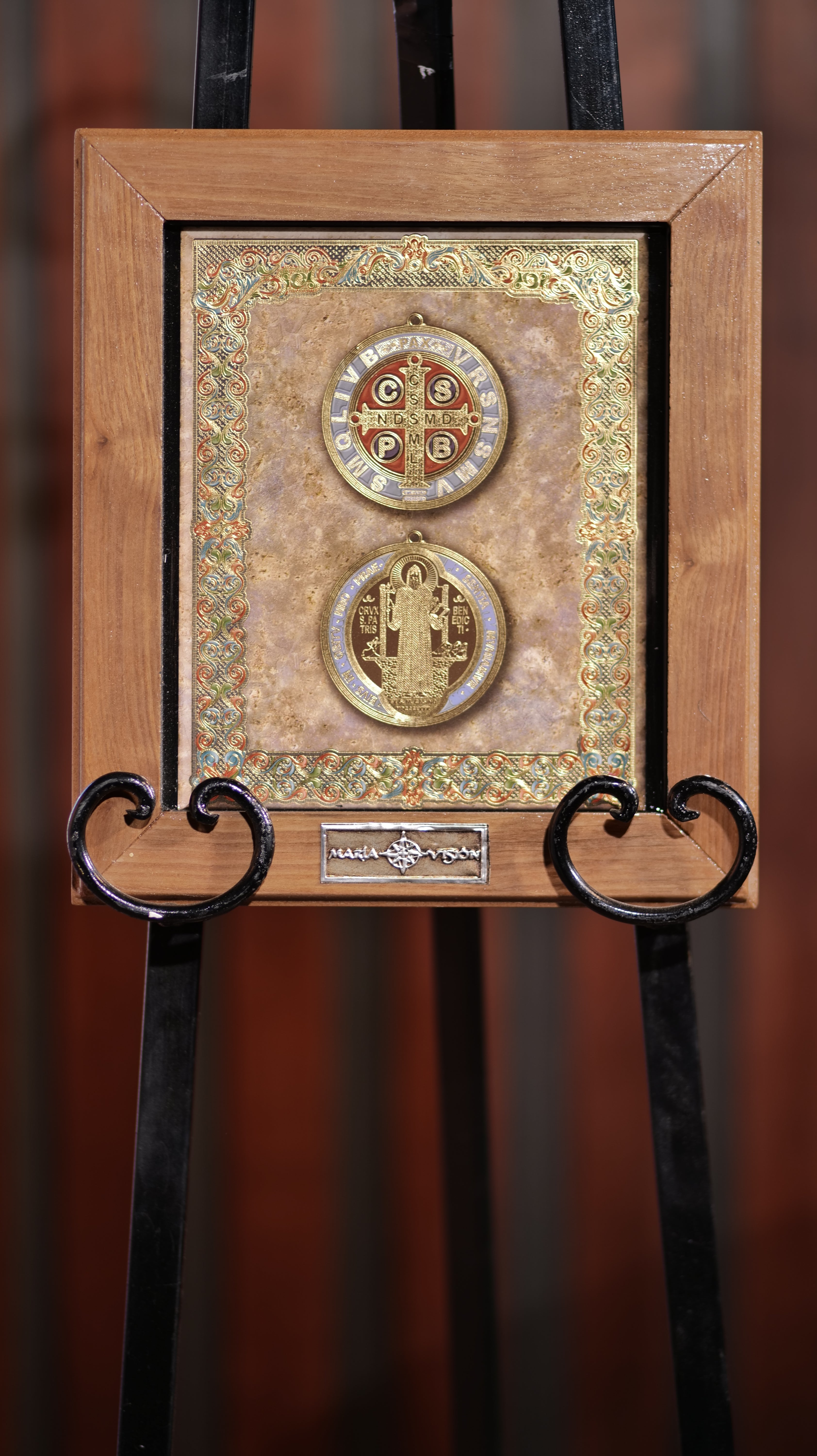 Cuadro religioso con la medalla de San Benito, el color del marco puede variar.