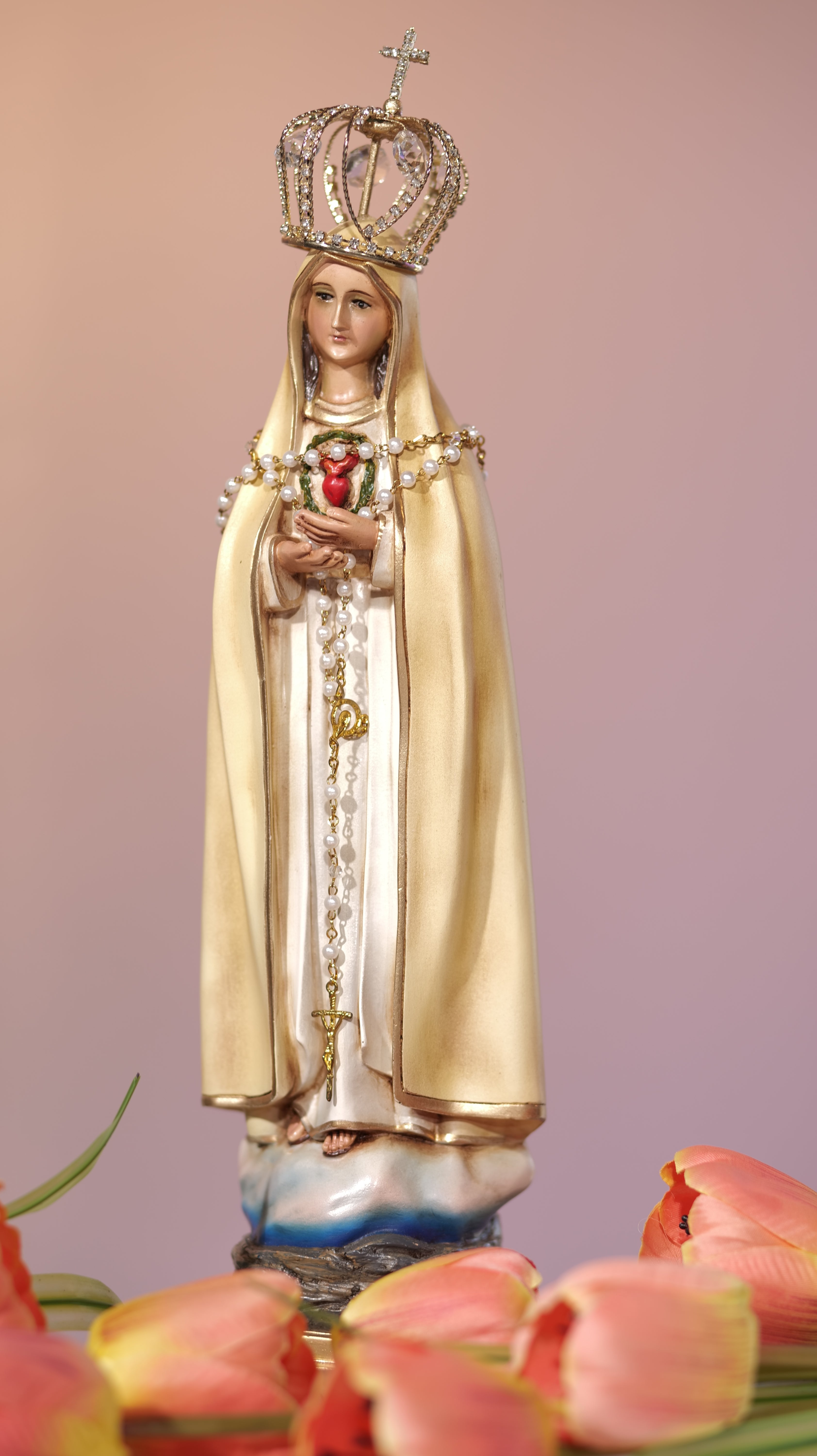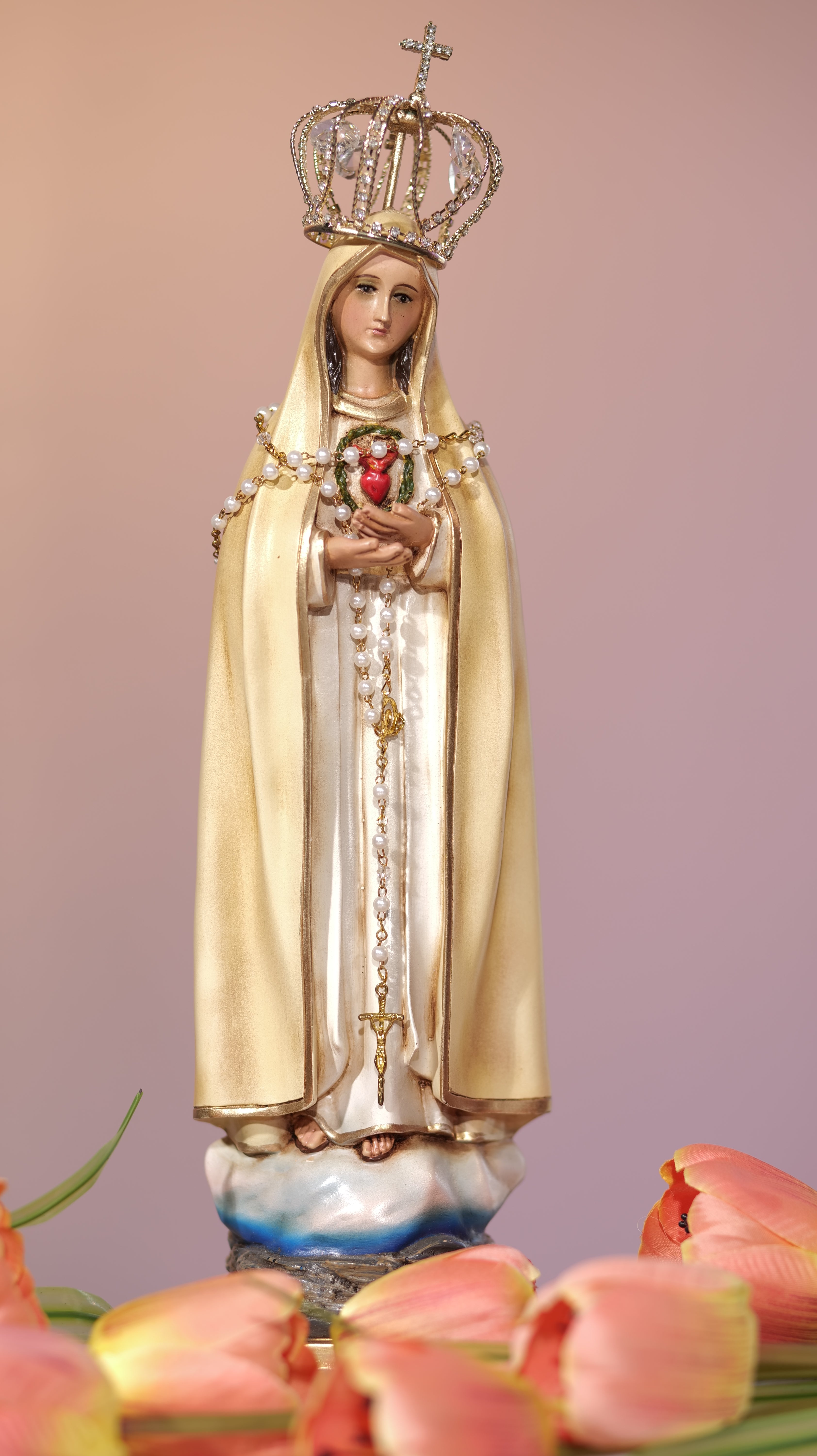 Virgen de Fátima de 30 cm ene ojos de vidrio y pestañas.