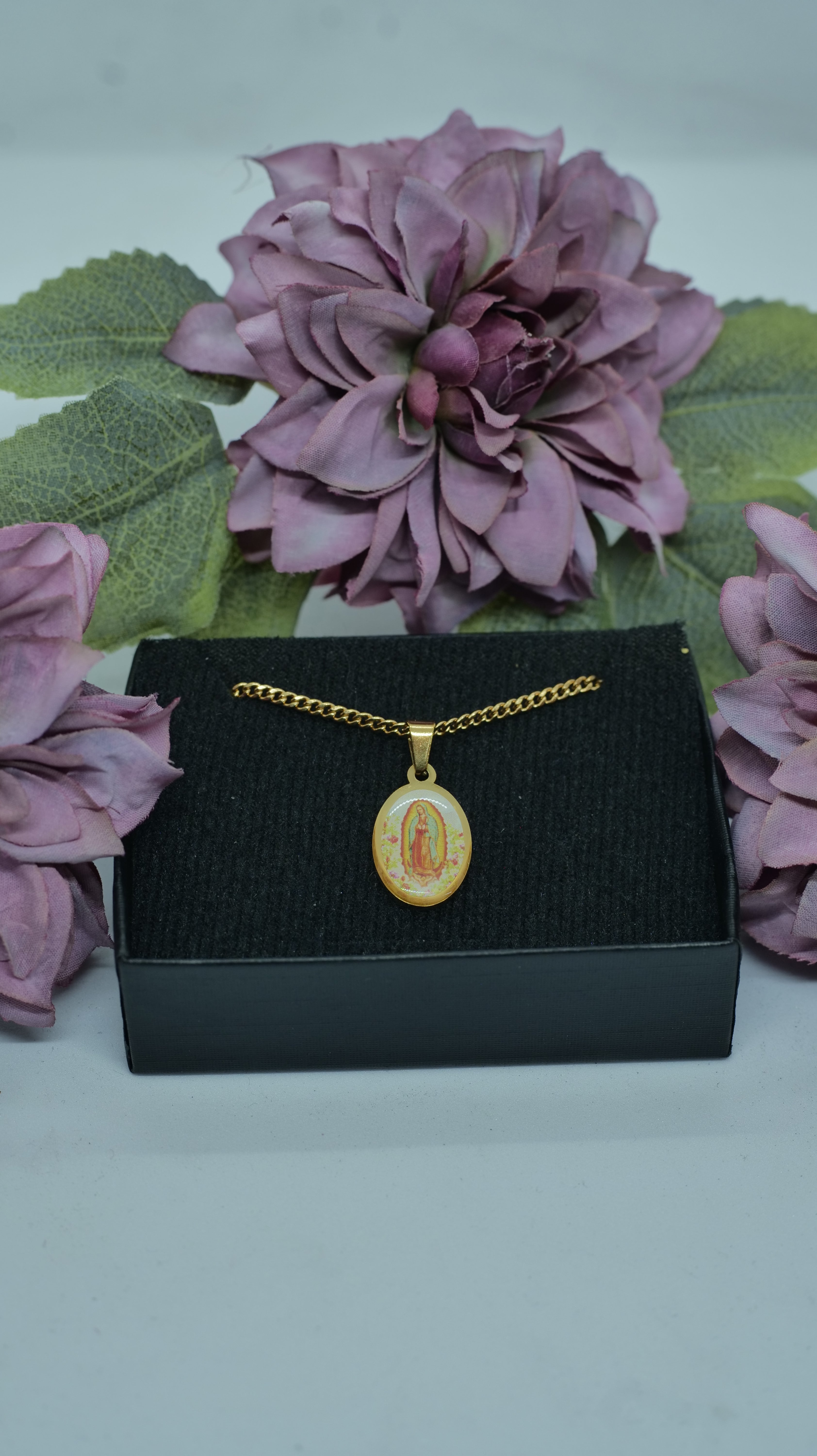 Cadena acero inoxidable color oro, con medalla de Virgen de Guadalupe a color cubierta de resina.