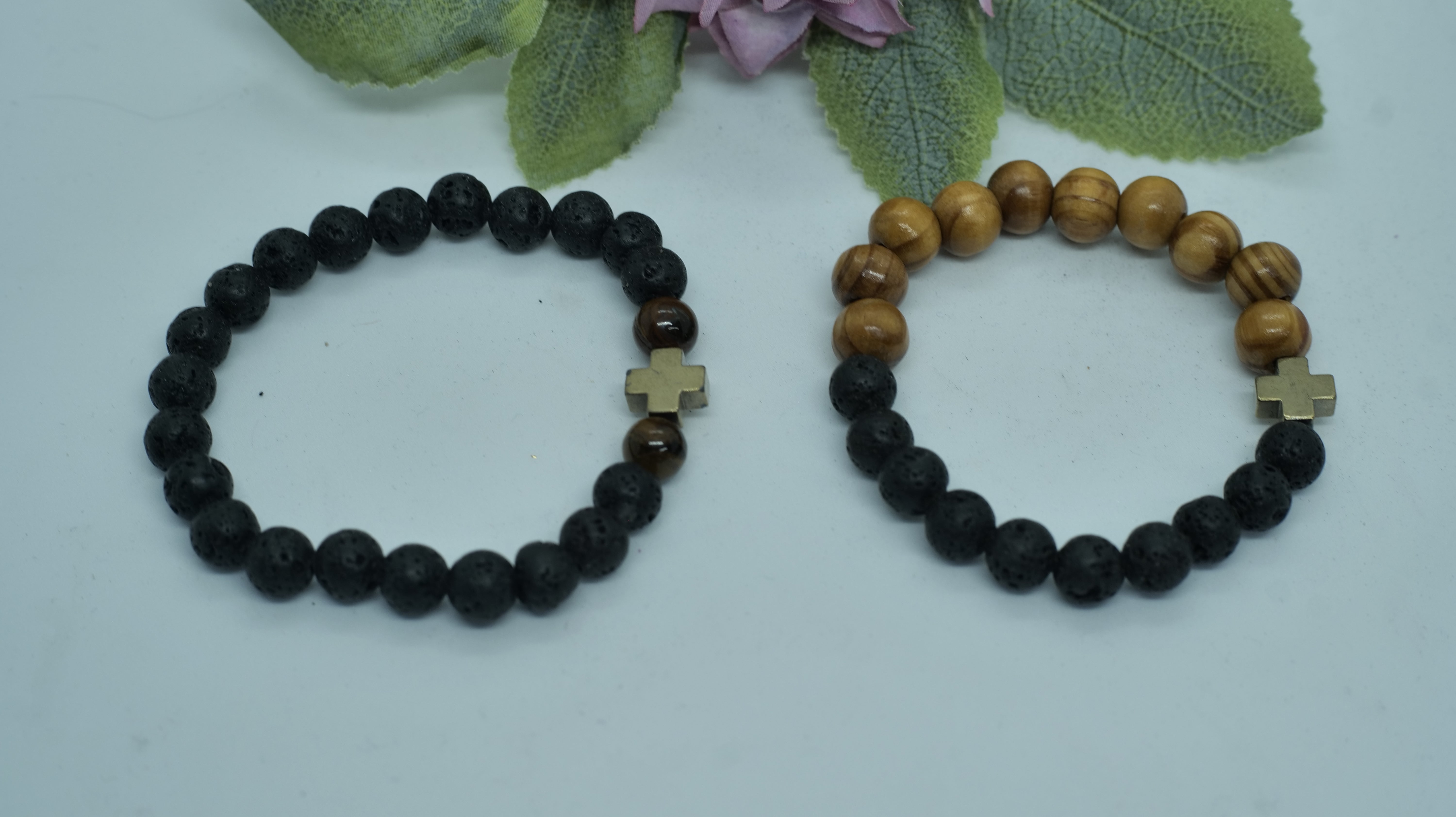 Pulsera elaborada con piedra volcánica y dije de cruz acero inoxidable.