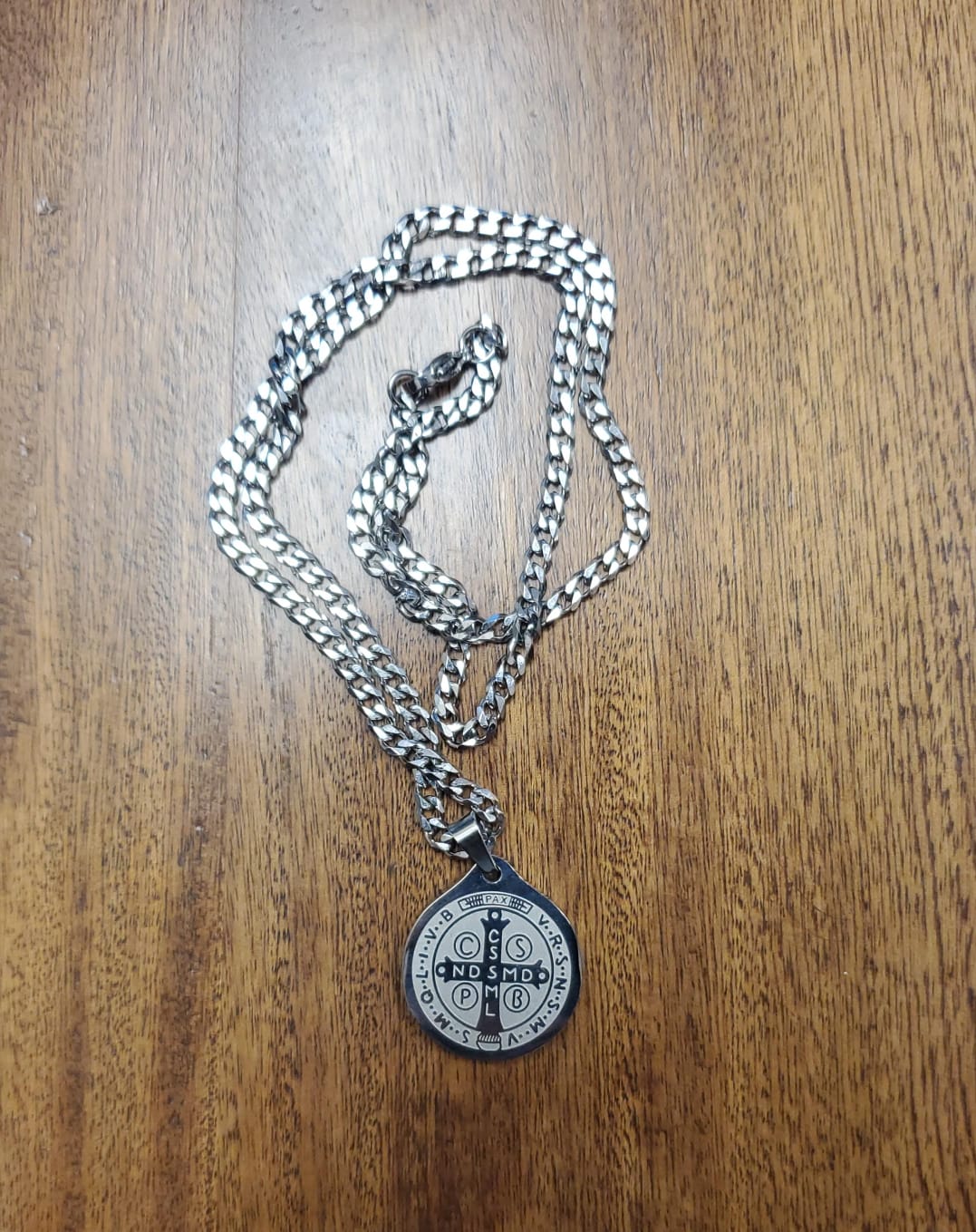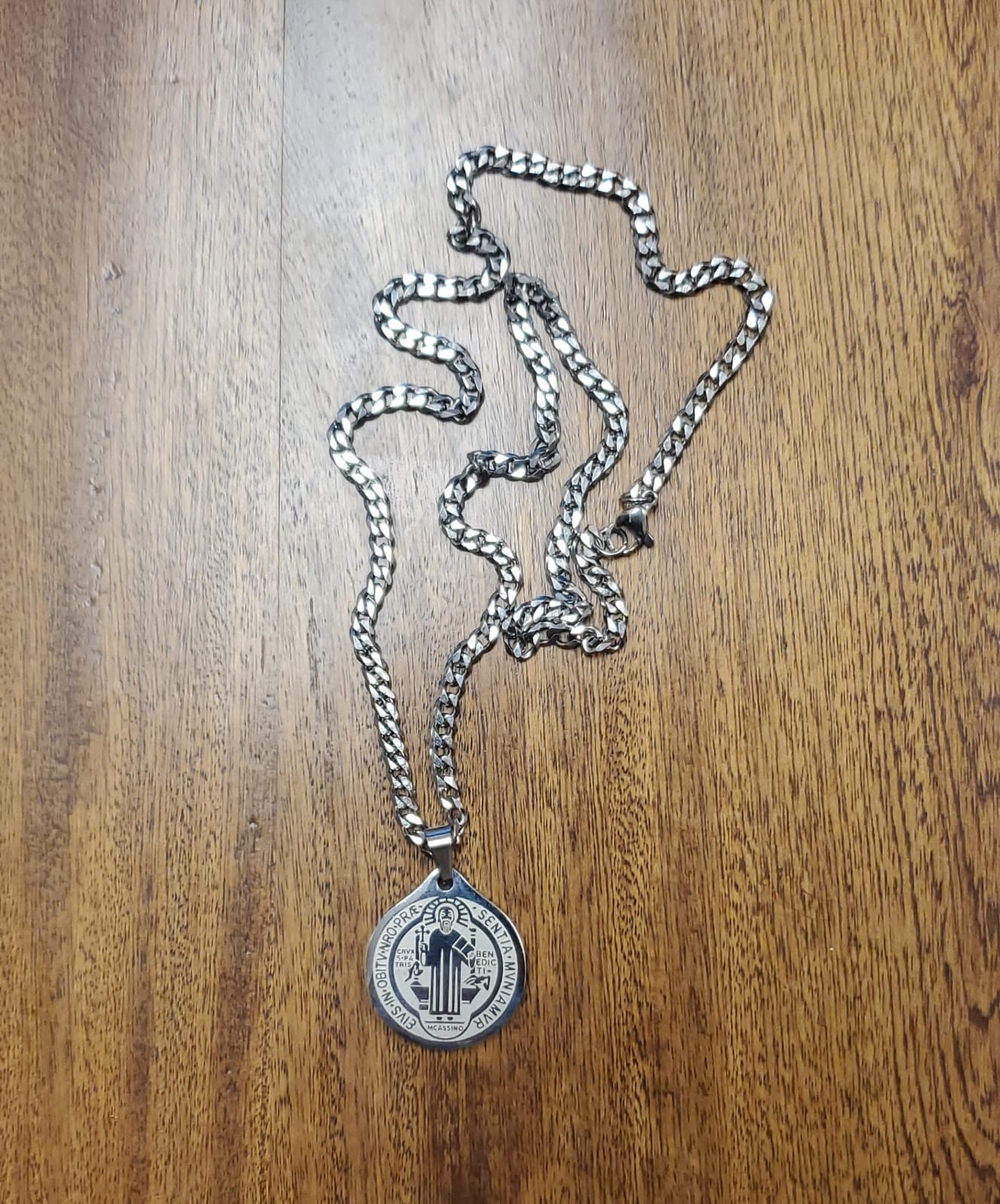 Cadena acero inoxidable color plata, con medalla de San Benito. El tipo de cadena puede variar según existencia.