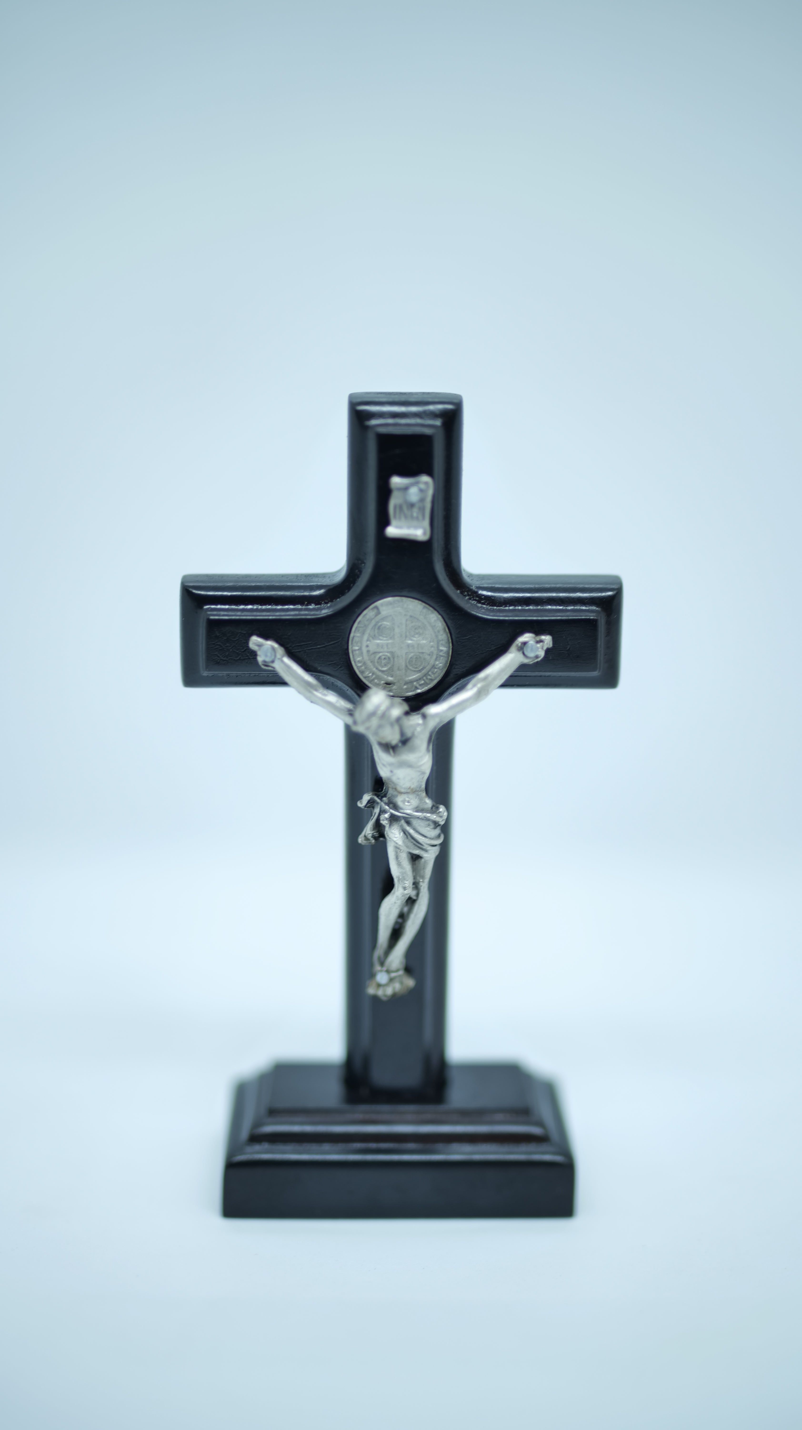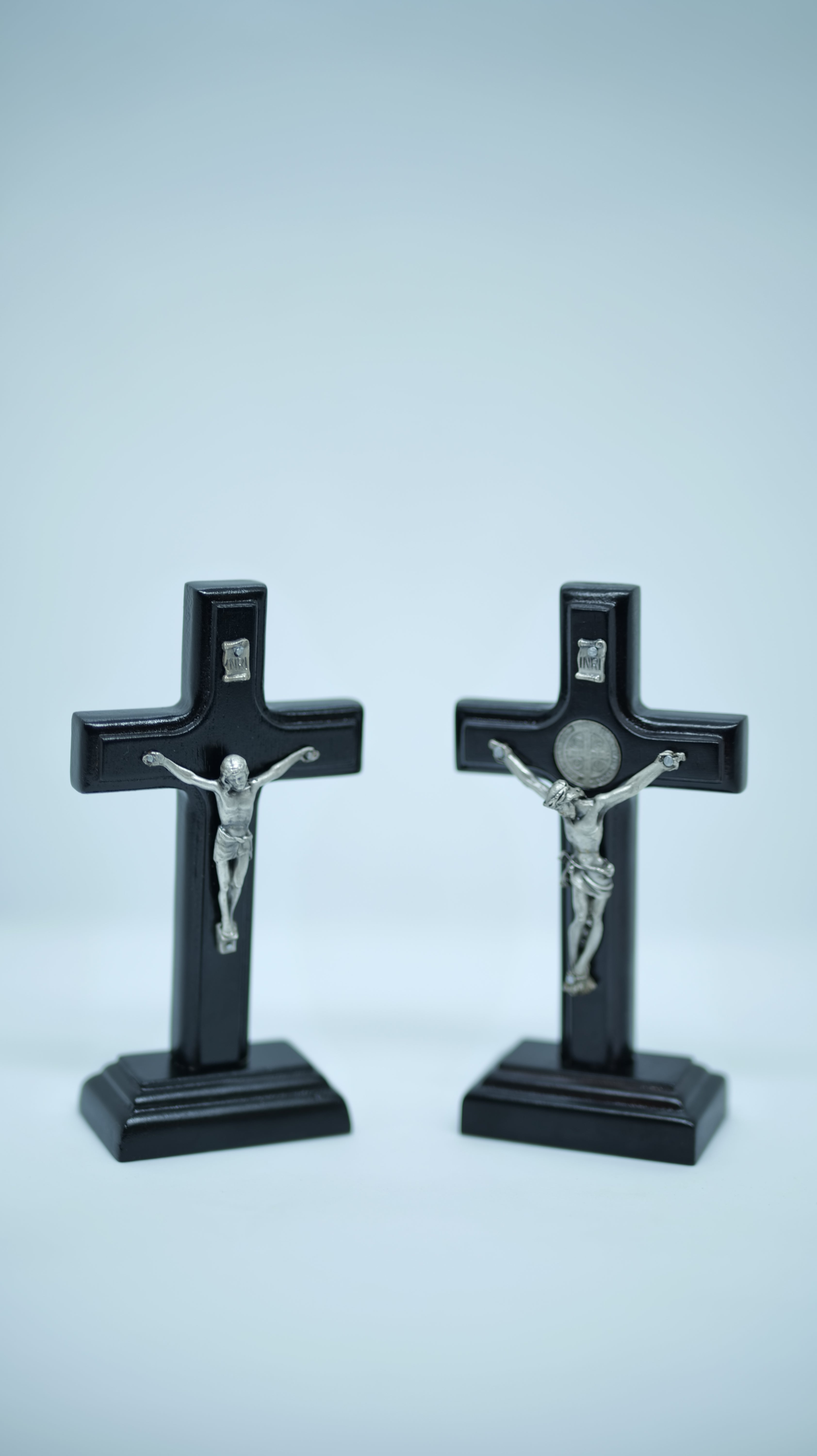 Cruz de madera con base, ideal para tu mesa o escritorio. Disponible en dos modelos.