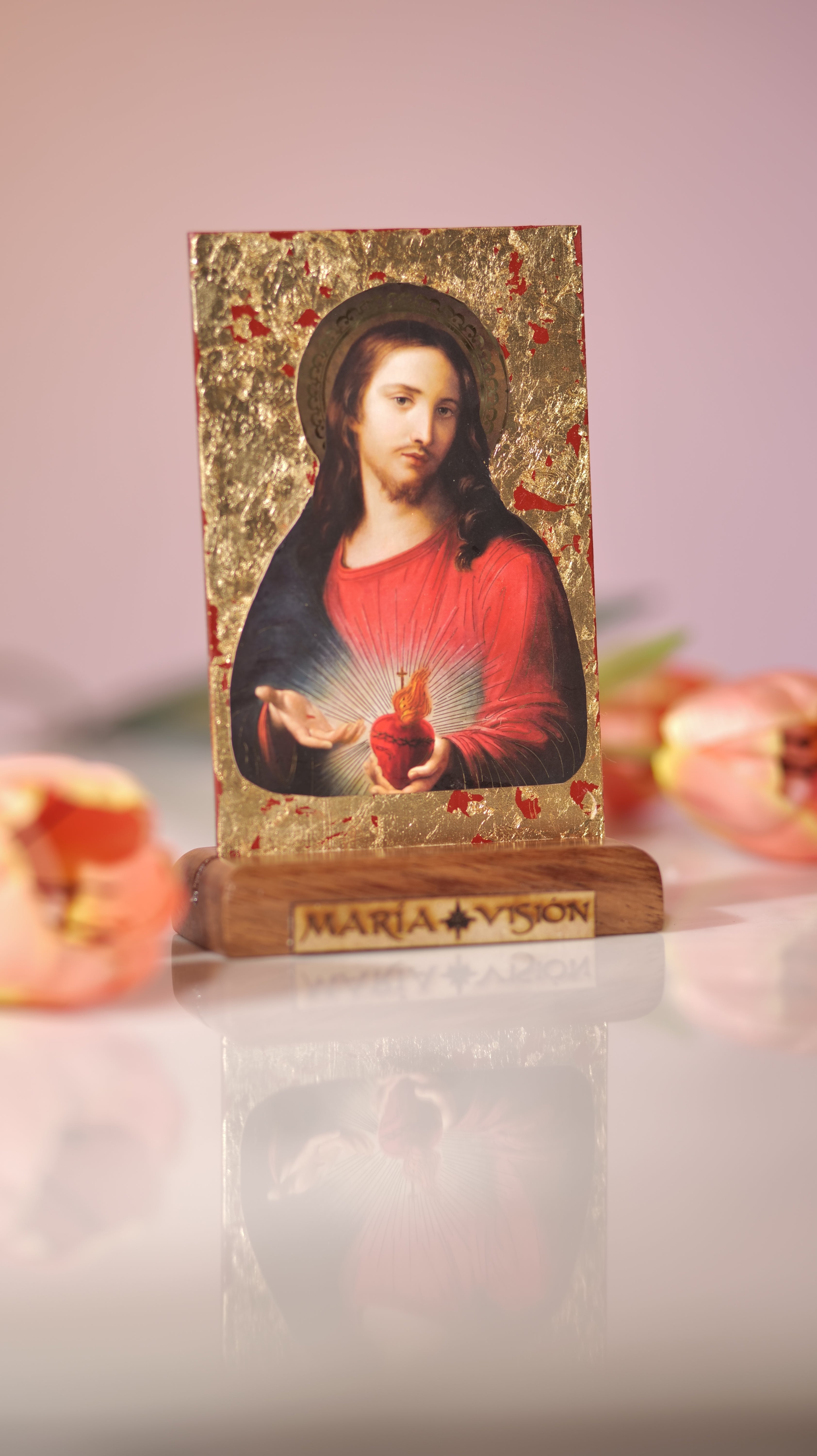 Cuadro del Sagrado Corazón, terminado en oro, con base de madera grabada.